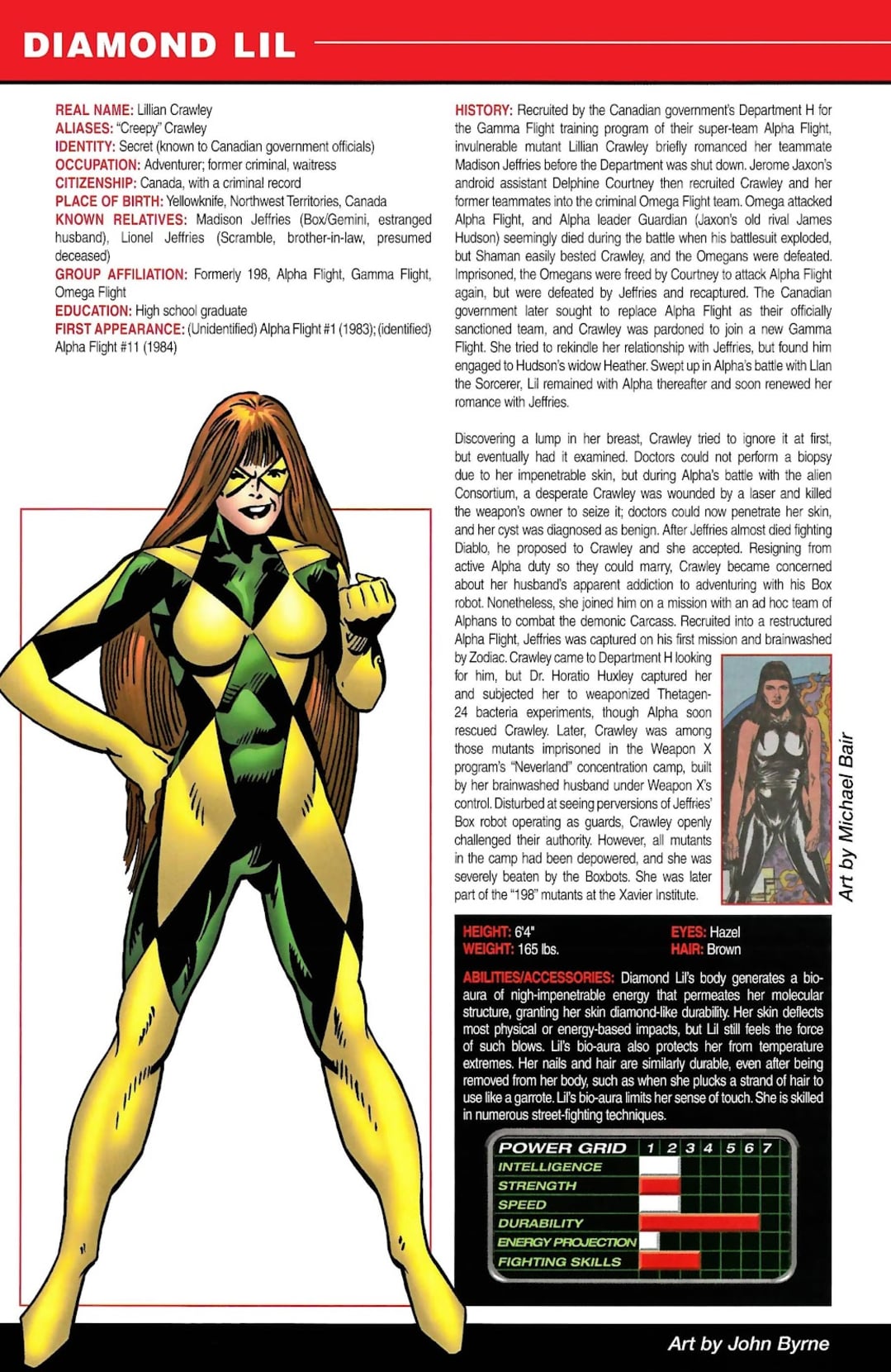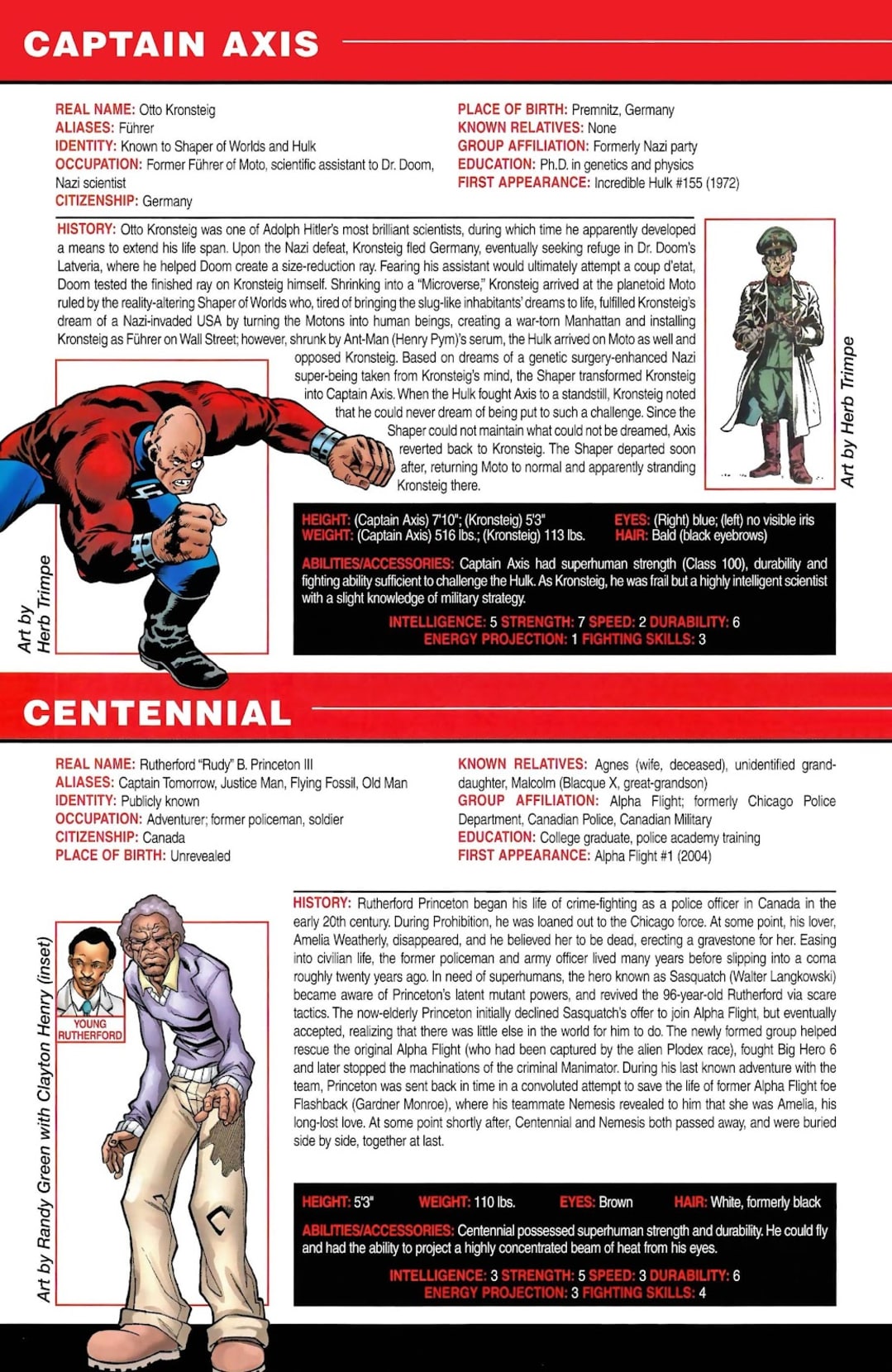 Please note: Entries here are taken from ALL-NEW OFFICIAL HANDBOOK OF THE MARVEL UNIVERSE A TO Z (2006) #2, MARVEL LEGACY: THE 1980's HANDBOOK (2007) #1 and ALL-NEW OFFICIAL HANDBOOK OF THE MARVEL UNIVERSE A TO Z (2006) #3 with minor formatting changes.